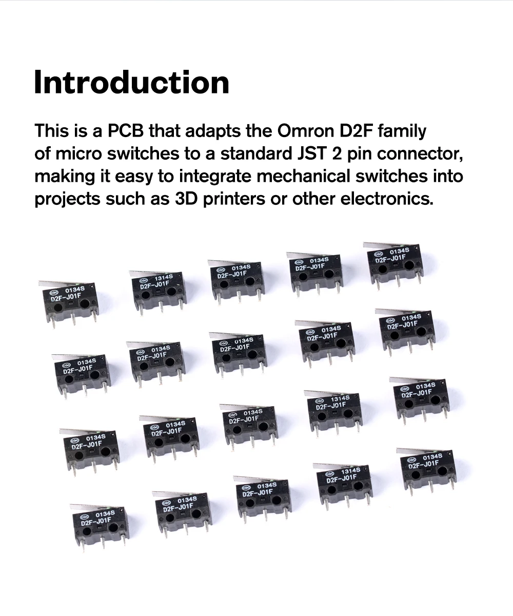 This is a PCB that adapts the Omron D2F familyof micro switches to a standard JST 2 pin connectormaking it easy to integrate mechanical switches intoprojects such as 3D printers or other electronics.