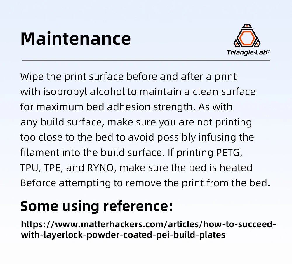 Wipe the print surface before and after a printwith isopropyl alcohol to maintain a clean surfacefor maximum bed adhesion strength. As withany build surface, make sure you are not printingtoo close to the bed to avoid possibly infusing thefilament into the build surface. lf printing PETG,TPU, TPE, and RYNO, make sure the bed is heatedBeforce attempting to remove the print from the bed.