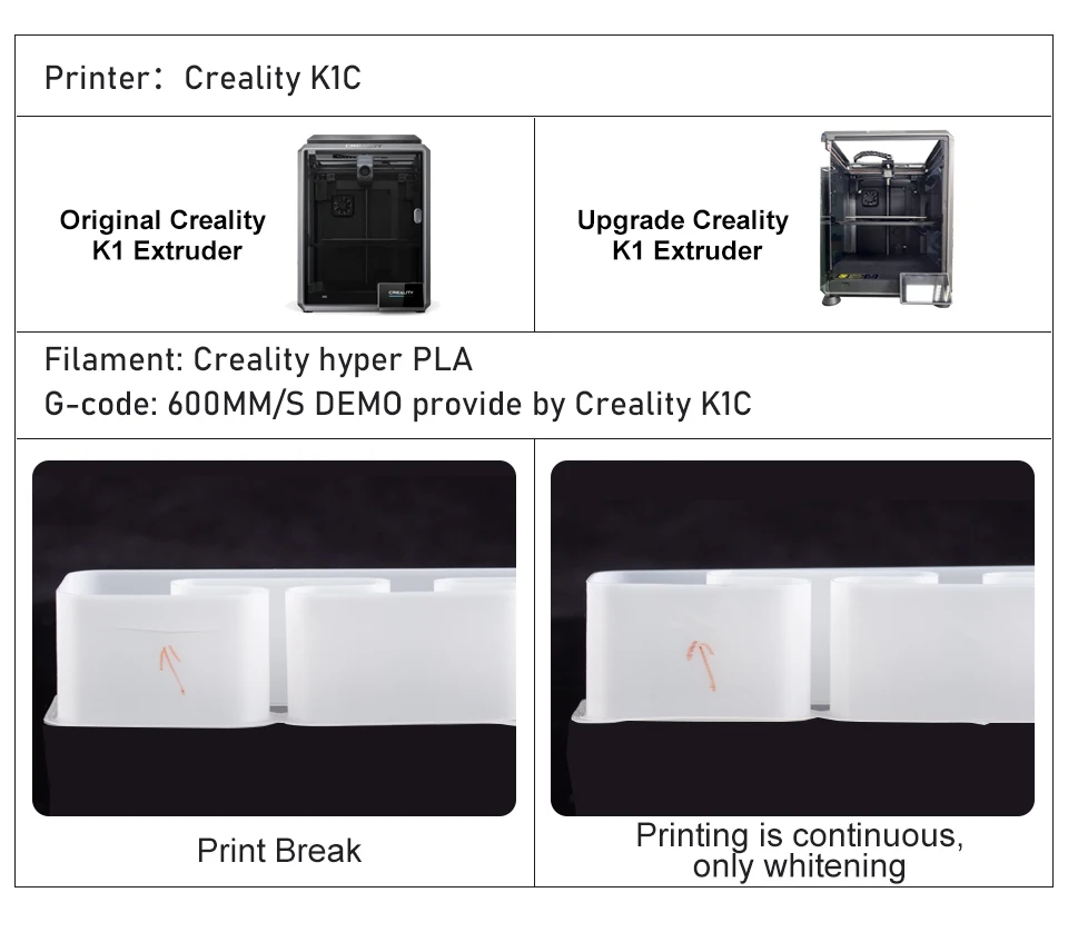 As shown in the figure, after replacing the K1 printer with an OT hotend, the finished product printed at 600MM/S with the same Gcode file, the same filament, and the same nozzle is just as good, and the surface looks basically the same. But when we apply the same destructive force on the same place, the original hotend prints have layer separation, while the OT-hotend prints only show stress whitening. This indicat that the OT hotend has a higher flow rate in which the filament is more fully melted.
