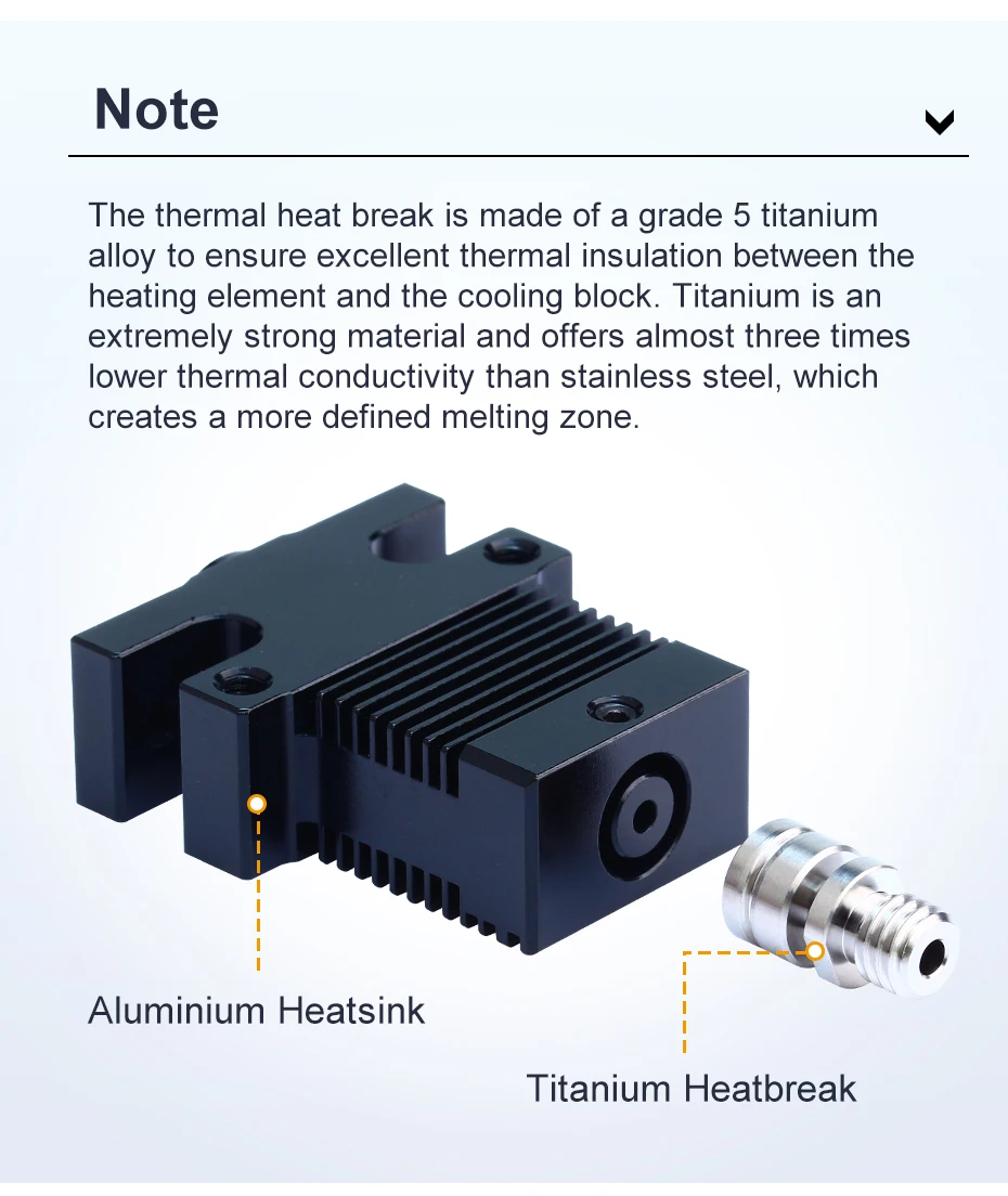 The thermal heat break is made of a grade 5 titanium alloy to ensure excellent thermal insulation between the heating element and the cooling block. Titanium is an extremely strong material and offers almost three times lower thermal conductivity than stainless steel, which creates a more defined melting zone.