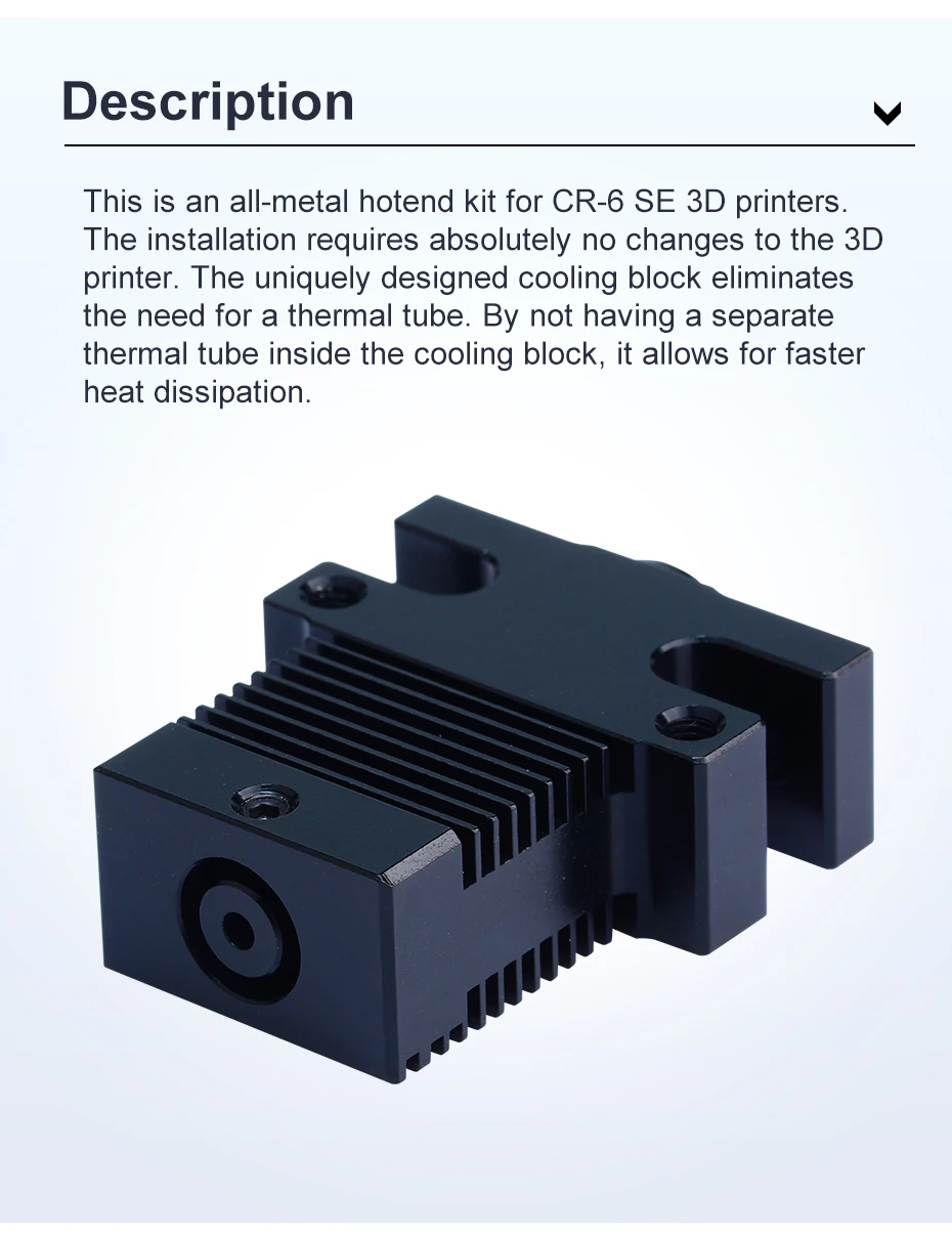 This is an all-metal hotend kit for CR-6 SE 3D printers. The installation requires absolutely no changes to the 3D printer. The uniquely designed cooling block eliminates the need for a thermal tube. By not having a separate thermal tube inside the cooling block, it allows for faster heat dissipation.