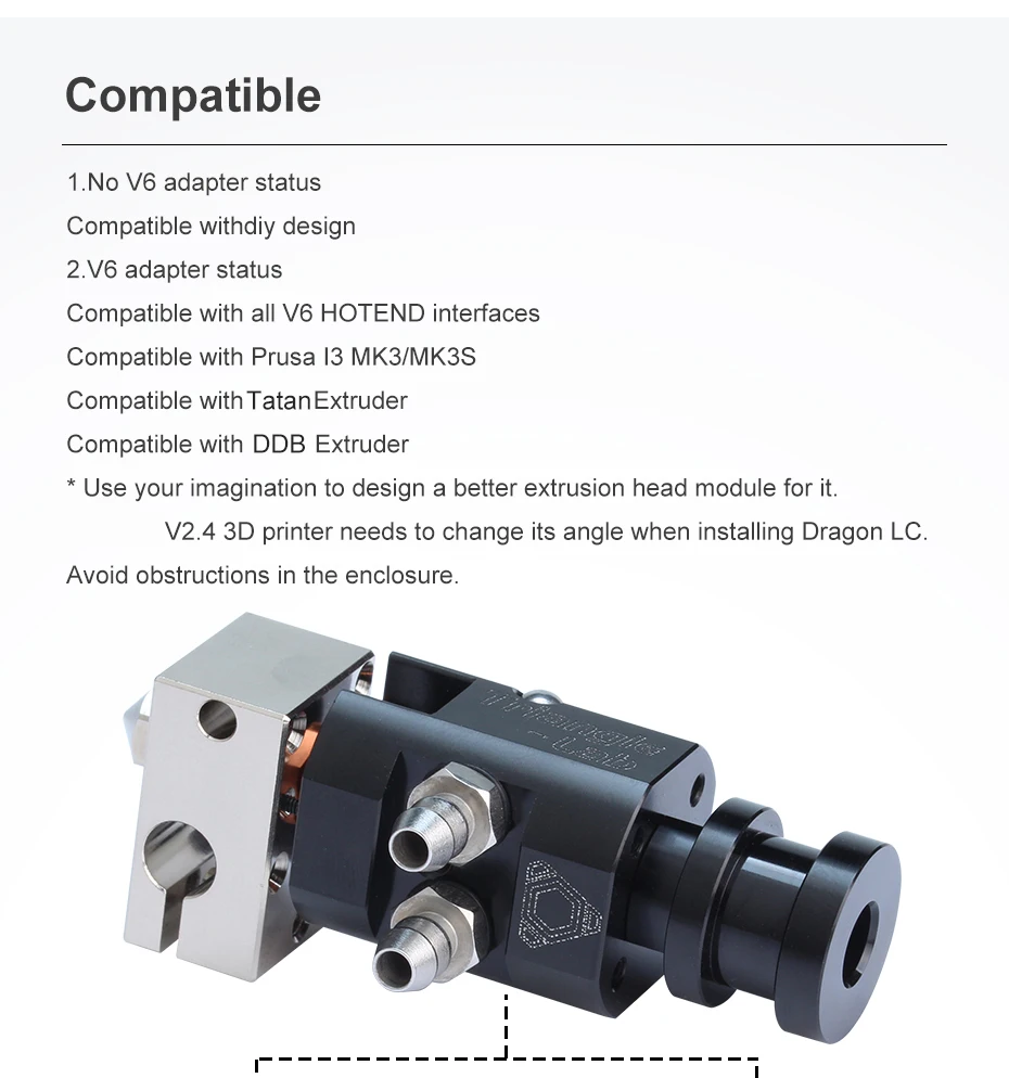 * V2.4 3D printer needs to change its angle when installing Dragon LC. Avoid obstructions in the enclosure.
