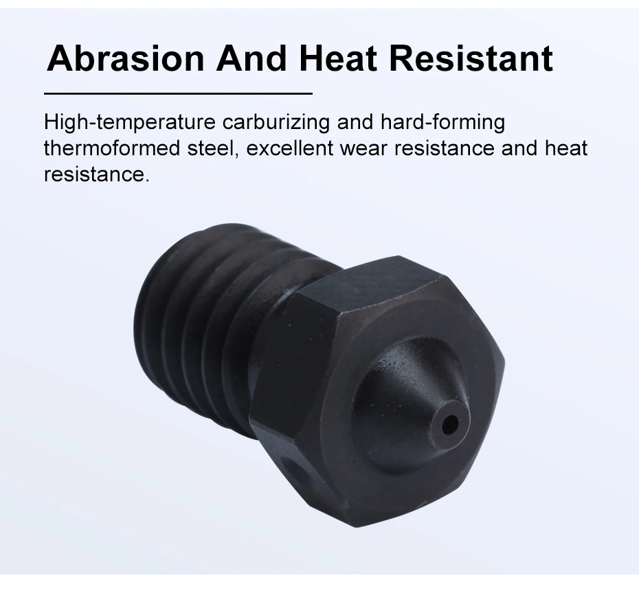 DescriptionTrianglelab Top quality Hardened Steel V6 Nozzles for peek 3D printers hotend for v6 hotend for peer for carbon fibre.Hardened abrasion-resistant nozzles developed to last a lifetime. 3D printing with abrasives such as carbon fiber, glow-in-the-dark PLA or even filled filaments like woodfill all take their toll on a standard nozzle. These nozzles are fully integrated into the Ecosystem and will fit V6, Lite6, and Tatan Aero HotEnds, and are compatible with Prusa 3D printers.This product only supports 1.75mm filament !!!If you 3D print with carbon fibre, filled PLA, or glow-in-the-dark filament, then this is the nozzle you need! Carbon filled filaments cause rapid and significant damage to standard nozzles. We've developed these incredibly wear-resistant nozzles to deal with the toughest filaments on the market.01.BenefitsPaying a little extra for a hardened, wear-resistant nozzle makes both practical and economic sense. By the time you've printed a single spool of abrasive filament yoursquore saving money. It also saves a lot of time as you won't be constantly replacing worn out nozzles. And you'll be future-proofed for upcoming materials; we think these nozzles should be able to handle just about anything our material manufacturers think of next.02.AppearanceBecause of the thermal and chemical treatment applied to the nozzle they do have a bit of a dark, sometimes uneven looking coloration and surface finish, and there can be a small amount of residue on the nozzles despite our final cleaning process. The coloration variance is normal and doesn't affect function. Any residue left on the nozzle will quickly be flushed in the first few millimetres of extrusion, especially if you flush it out with an abrasive filled material!03.IdentificationAll nozzles in the series are now individually identifiable with markings on the flats of the hex head making them even more convenient to work with.