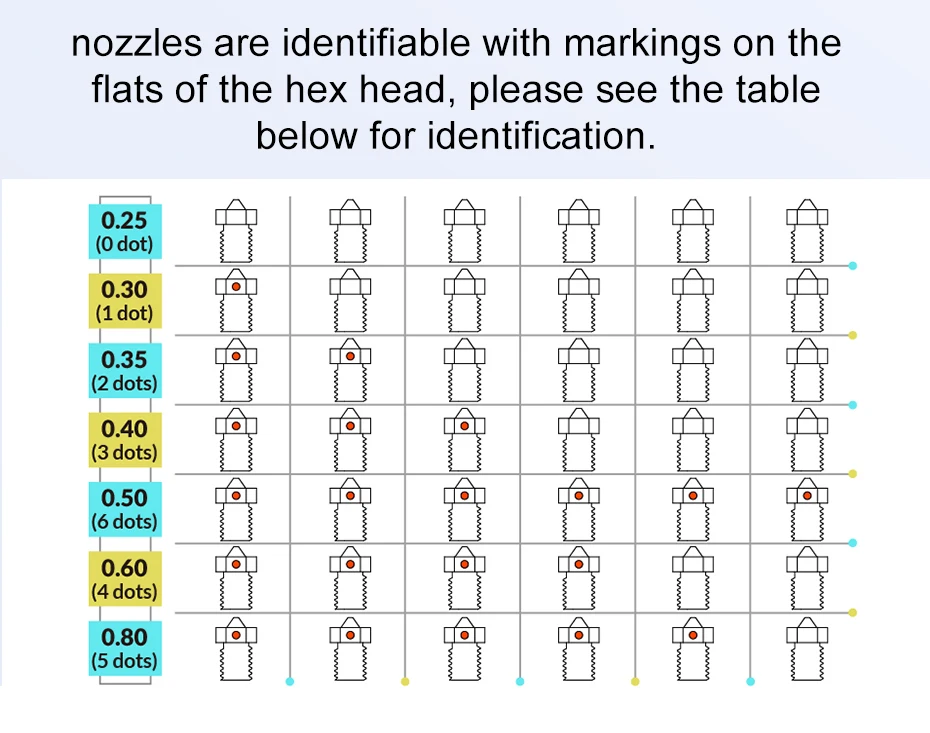 nozzles are identifiable with markings on the flats of the hex head, please see the table below for identification.