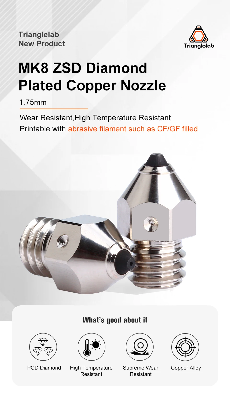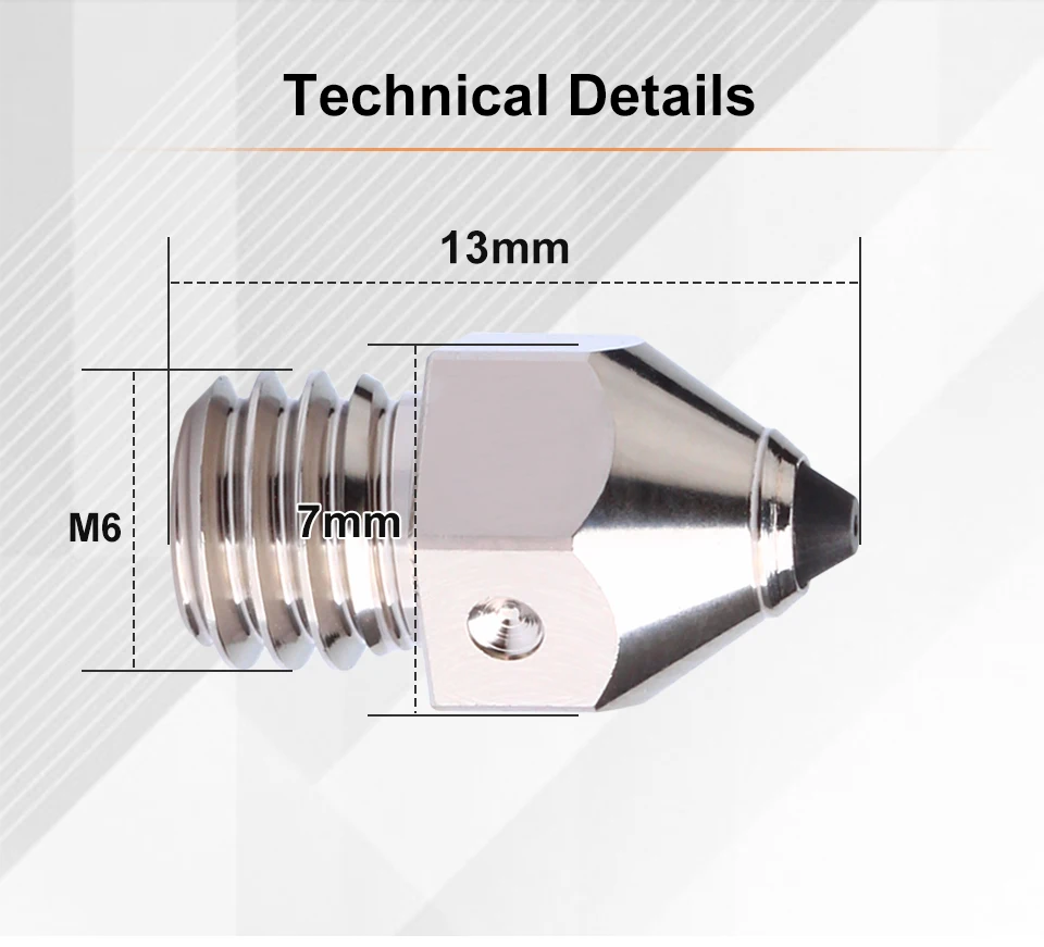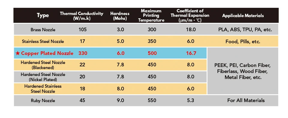 Copper alloys have 10 times the thermal conductivity of steel.Replacing this nozzle does not require an increase in print temperature like hardened steel nozzles to achieve the same print flow and results as brass or copper nozzles.