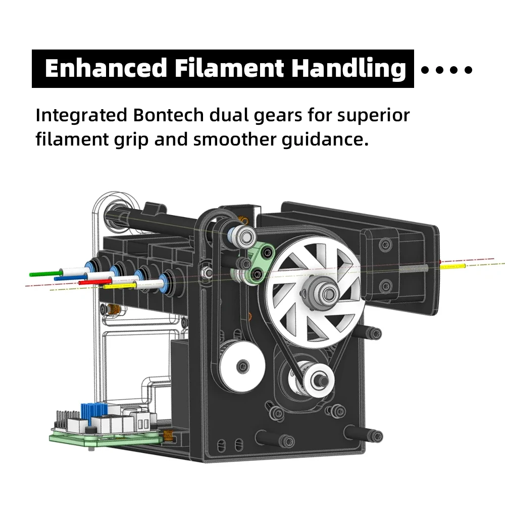 Integrated Bontech dual gears for superior filament grip and smoother guidance.