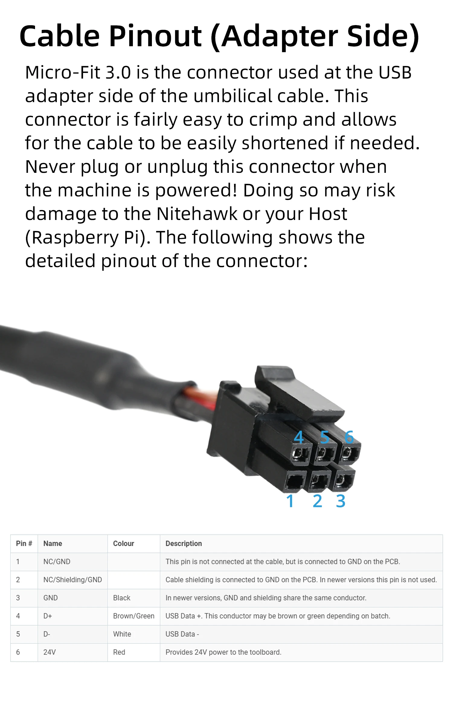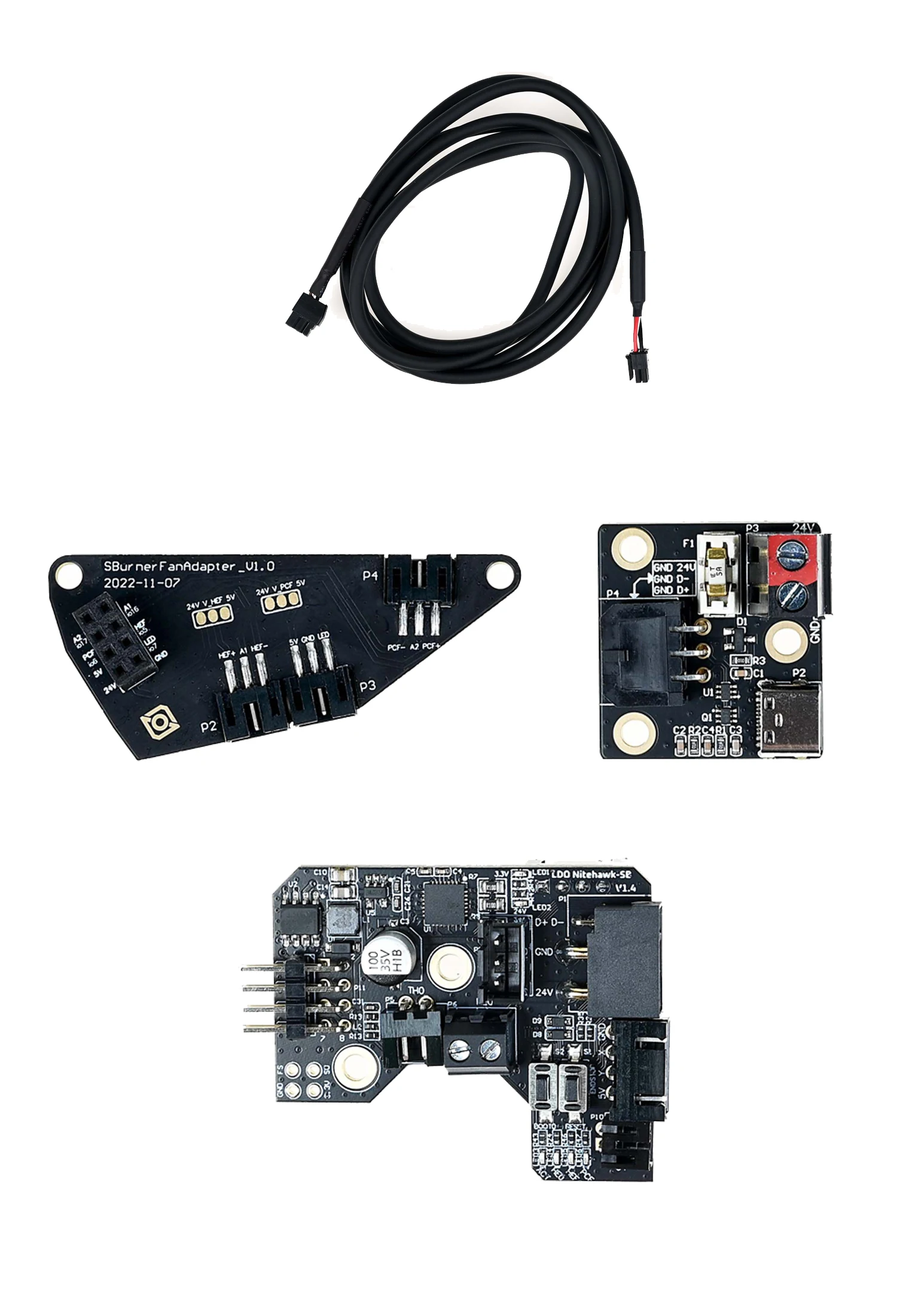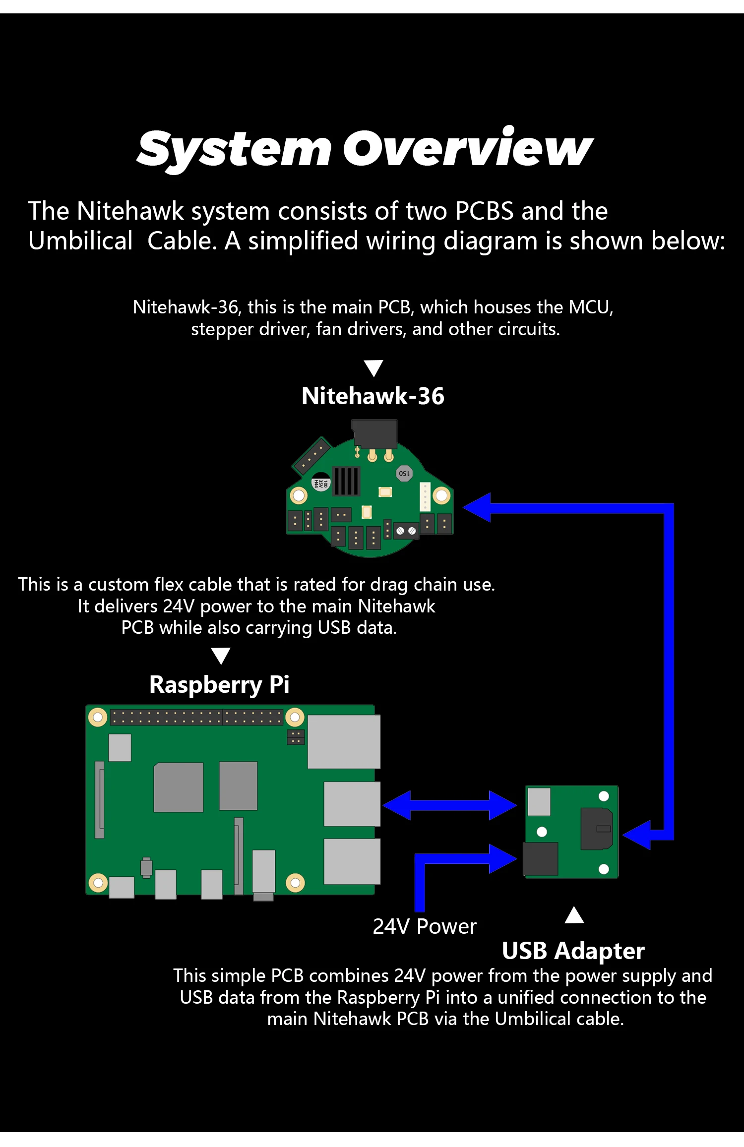 Nitehawk-36, this is the main PCB, which houses the MCU, stepper driver, fan drivers, and other circuits.This is a custom flex cable that is rated for drag chain use. It delivers 24V power to the main Nitehawk PCB while also carrying USB data.This simple PCB combines 24V power from the power supply and USB data from the Raspberry Pi into a unified connection to the main Nitehawk PCB via the Umbilical cable.