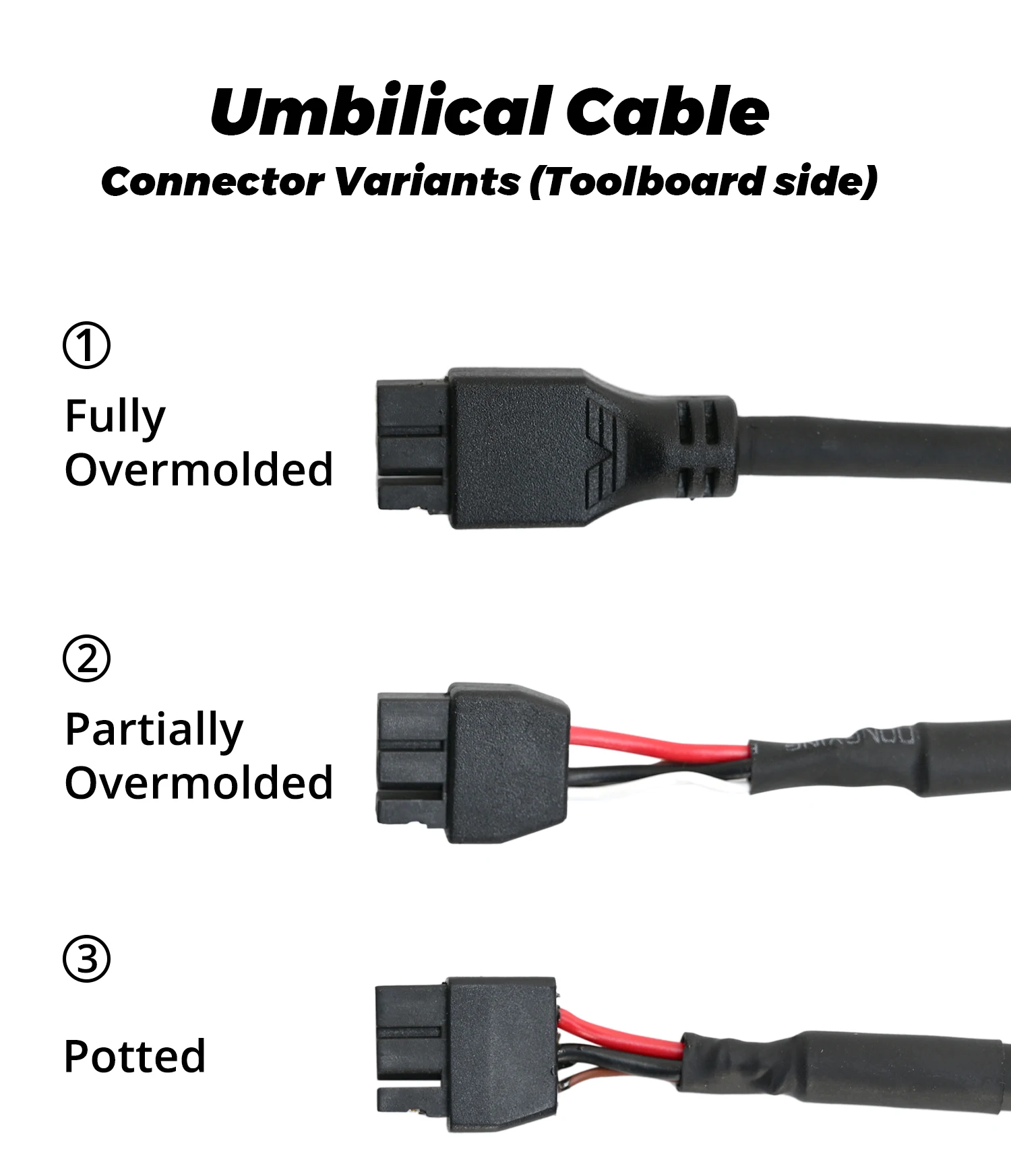 Fully Overmolded, this is the default version shipped with the Nitehawk-36 KIT Rev C and later. It offers good strain relief but does not have the same flexibility at the connector end as variants #2 or #3.Note: This version is NOT included in the recall since it would have further delayed the replacement of the defective boards. We apologize for any confusion. We are working to produce more and will offer them at cost to existing customers once they become available. Partially Overmolded, this is the default version that is shipped with Nitehawk-SB and Voron kits. This version has a length of exposed wiring which allows the cable to bend easily at the toolboard side (needed when using Stealthburner + cable chains) Potted, this variant shipped with the old Nitehawk-36 V1.2 and Nitehawk-SB kits. This variant has now been replaced by variant #1 and #2. *The rated bend radius of the cable is 28mm and the nominal remperature of the cable is 105C.