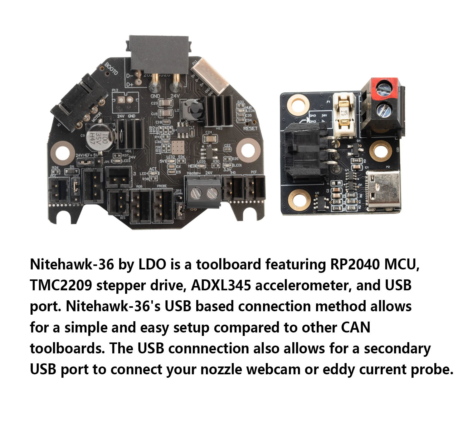 Nitehawk-36 by LDO is a toolboard featuring RP2040 MCU, TMC2209 stepper drive, ADXL345 accelerometer, and USB port. Nitehawk-36's USB based connection method allows for a simple and easy setup compared to other CAN toolboards. The USB connnection also allows for a secondary USB port to connect your nozzle webcam or eddy current probe.