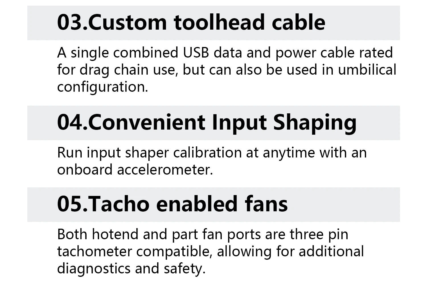 The hotend fan port is three pin tachometer compatible,allowing for additional diagnostics and safety.