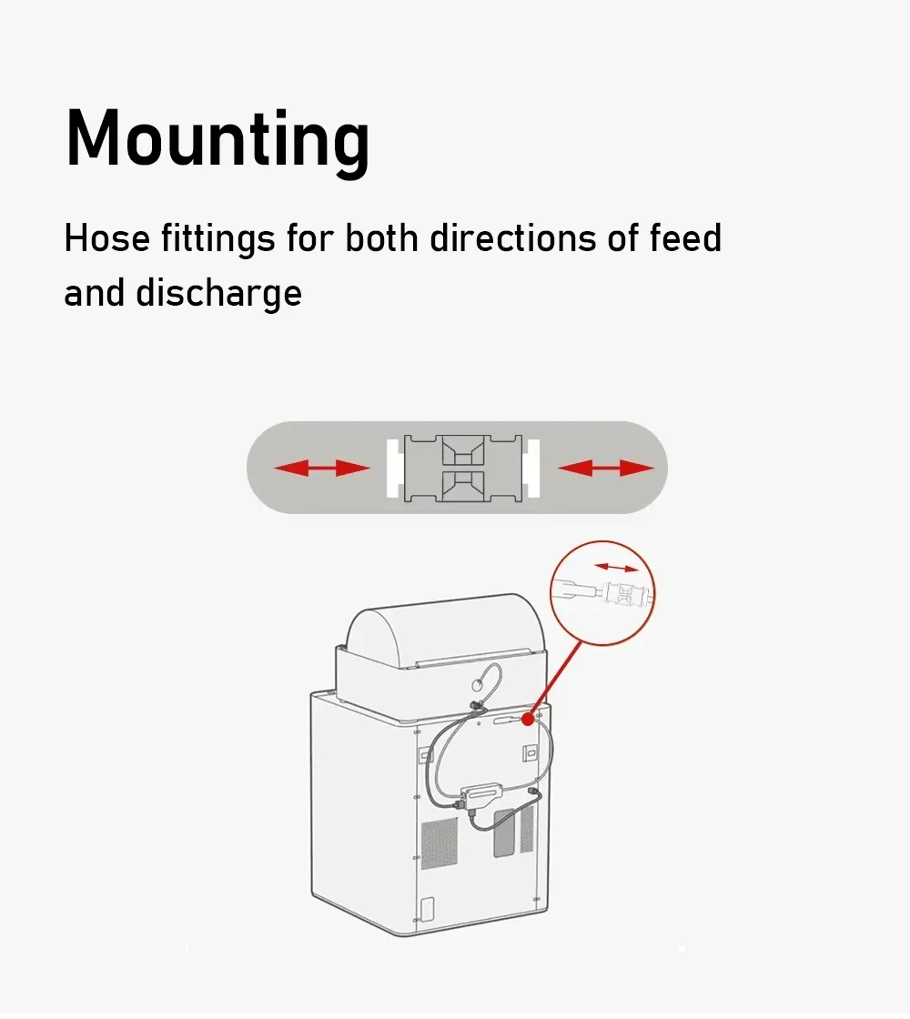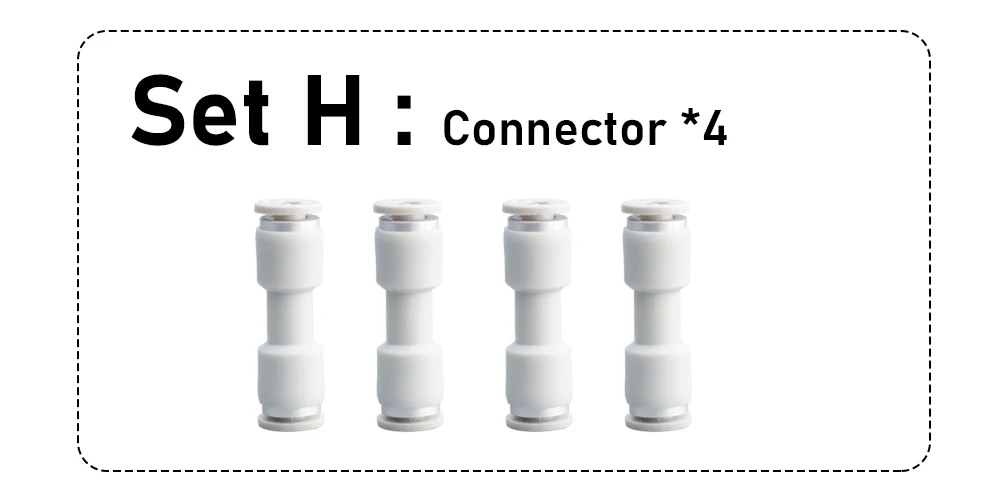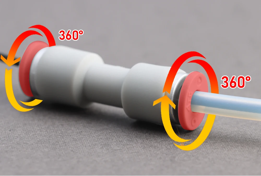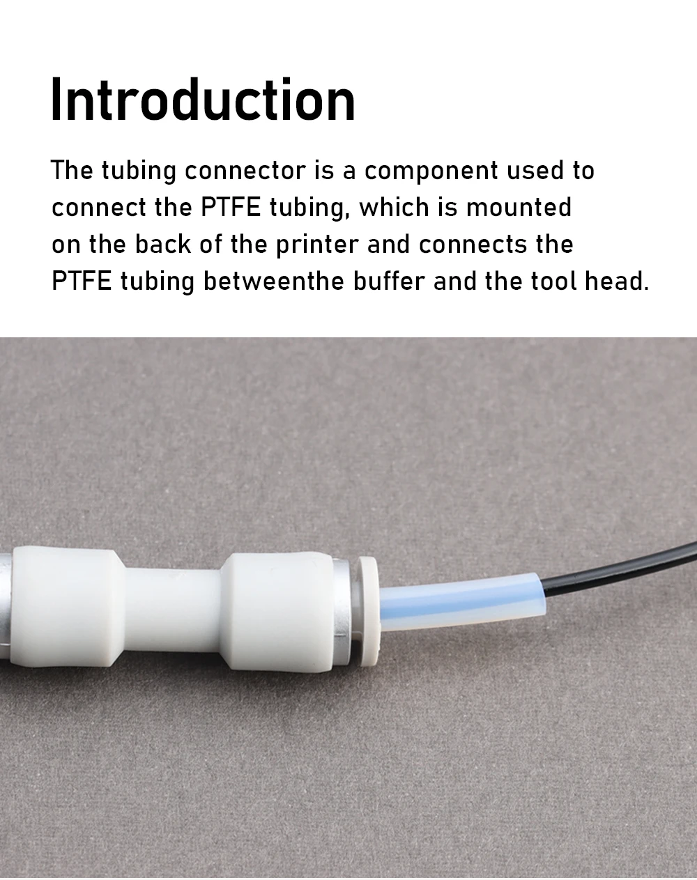 The tubing connector is a component used to connect the PTFE tubing, which is mounted on the back of the printer and connects the PTFE tubing betweenthe buffer and the tool head.