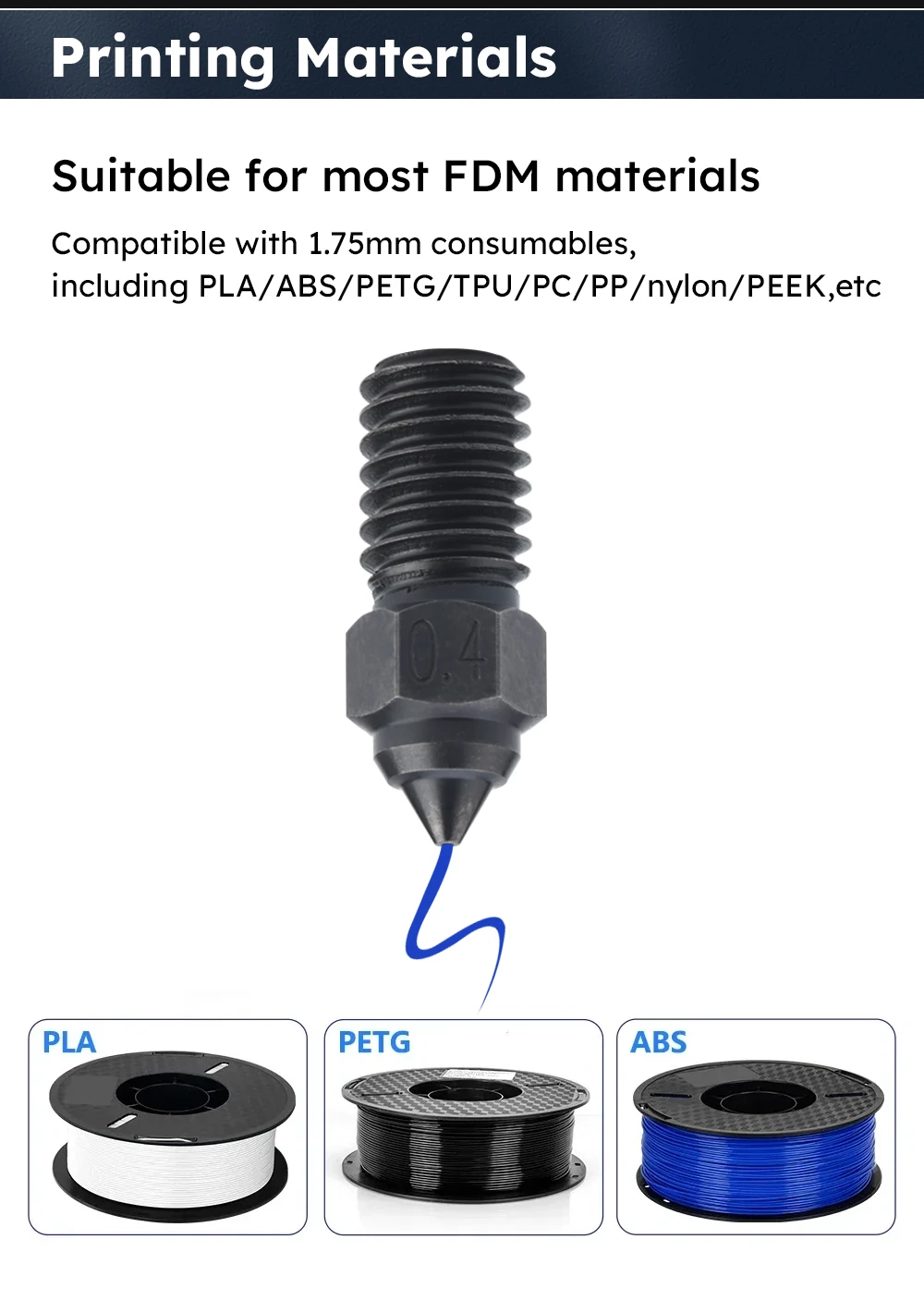 Compatible with 1.75mm consumables, including PLA/ABS/PETG/TPU/PC/PP/nylon/PEEK,etc