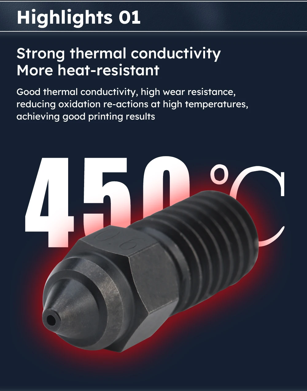 Good thermal conductivity, high wear resistance, reducing oxidation re-actions at high temperatures, achieving good printing resultsHighlights 02