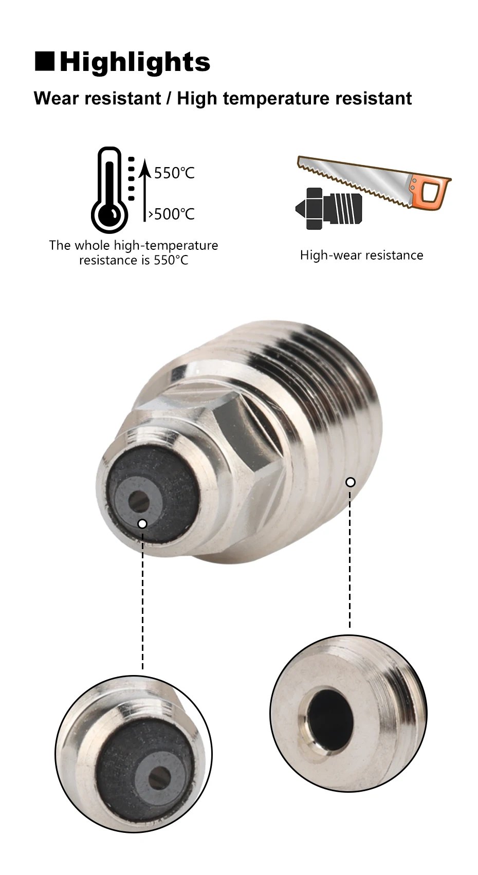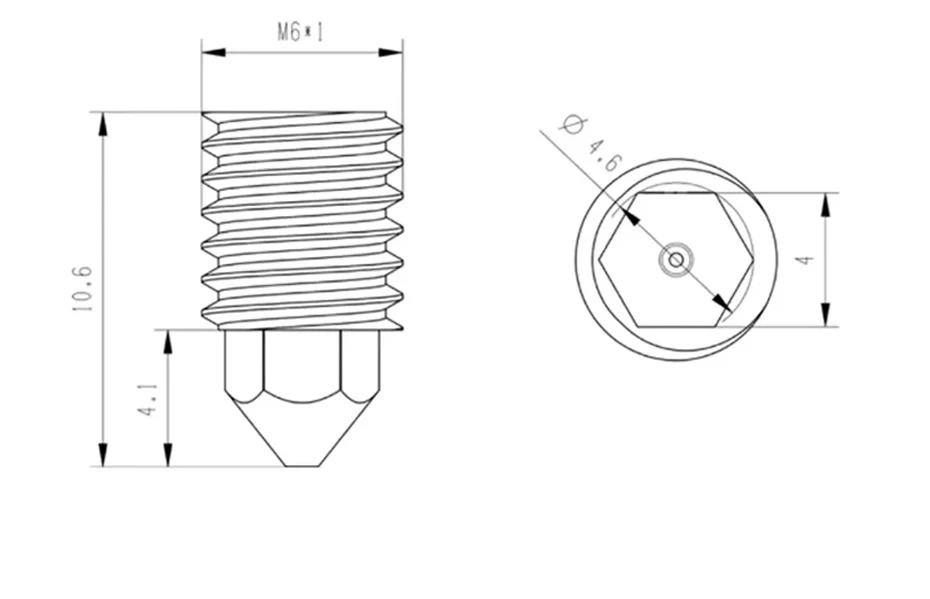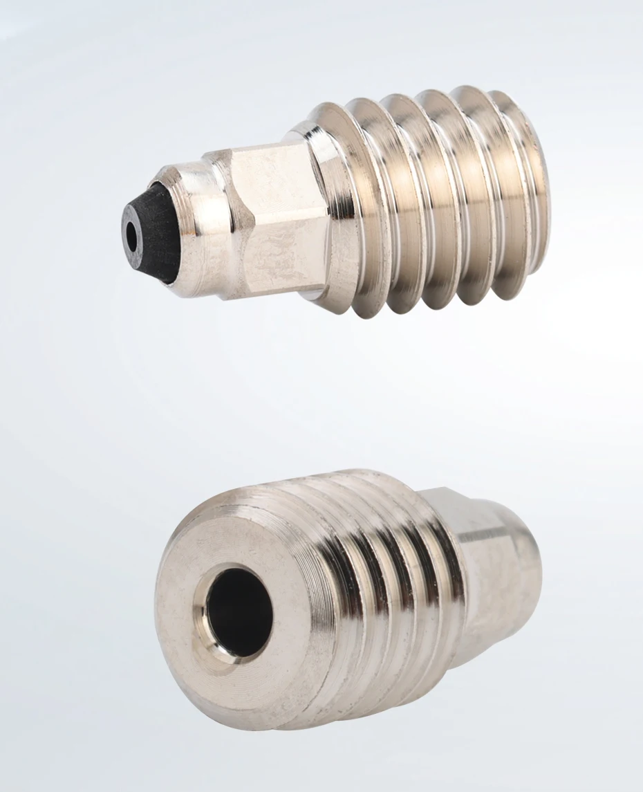 Body is Copper Alloy.Copper alloys have 10 times the thermal conductivity of steel.Replacing this nozzle does not require an increase in print temperature like hardened steel nozzles to achieve the same print flow and results as brass or copper nozzles. Insert is Polycrystalline Diamond PCD.Polycrystalline Diamond PCD material has extremely high hardness (twice that of ruby) and wear resistance and is generally used to make precision CNC cutting tools. It can easily handle a variety of carbon fiber glass fiber ceramic fiber or metal powder filled polymers. PCD material also has extremely high thermal conductivity (30% higher than pure copper) and extremely low coefficient of friction, making it an ideal material for extruding hot melt plastics.