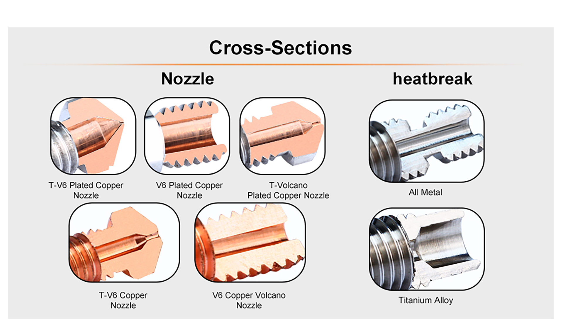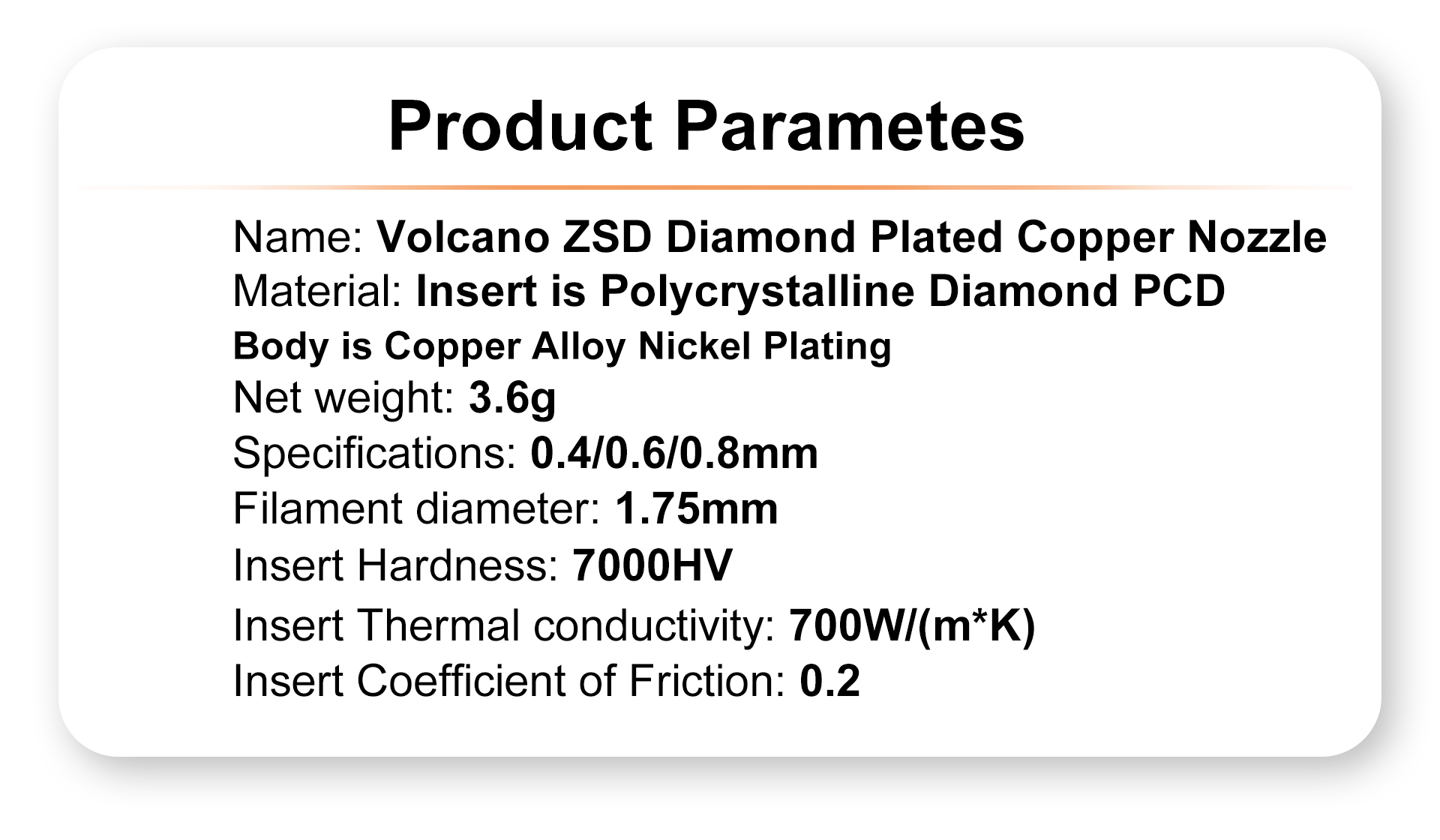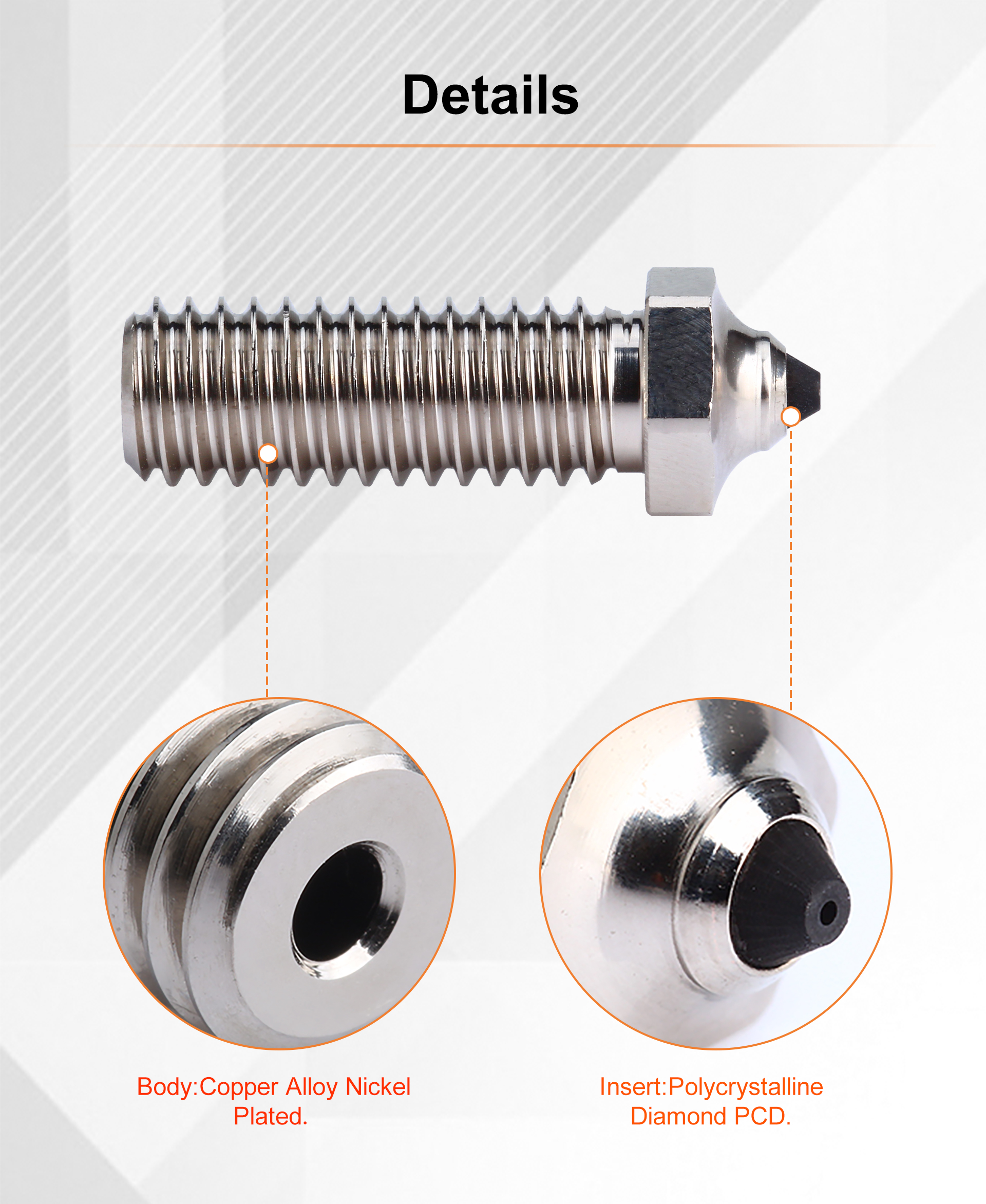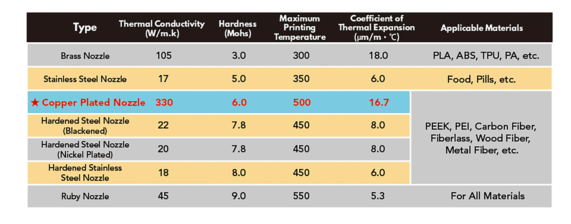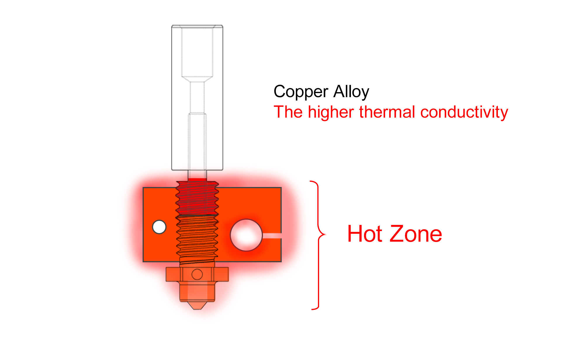 Copper alloys have 10 times the thermal conductivity of steel.Replacing this nozzle does not require an increase in print temperature like hardened steel nozzles to achieve the same print flow and results as brass or copper nozzles.