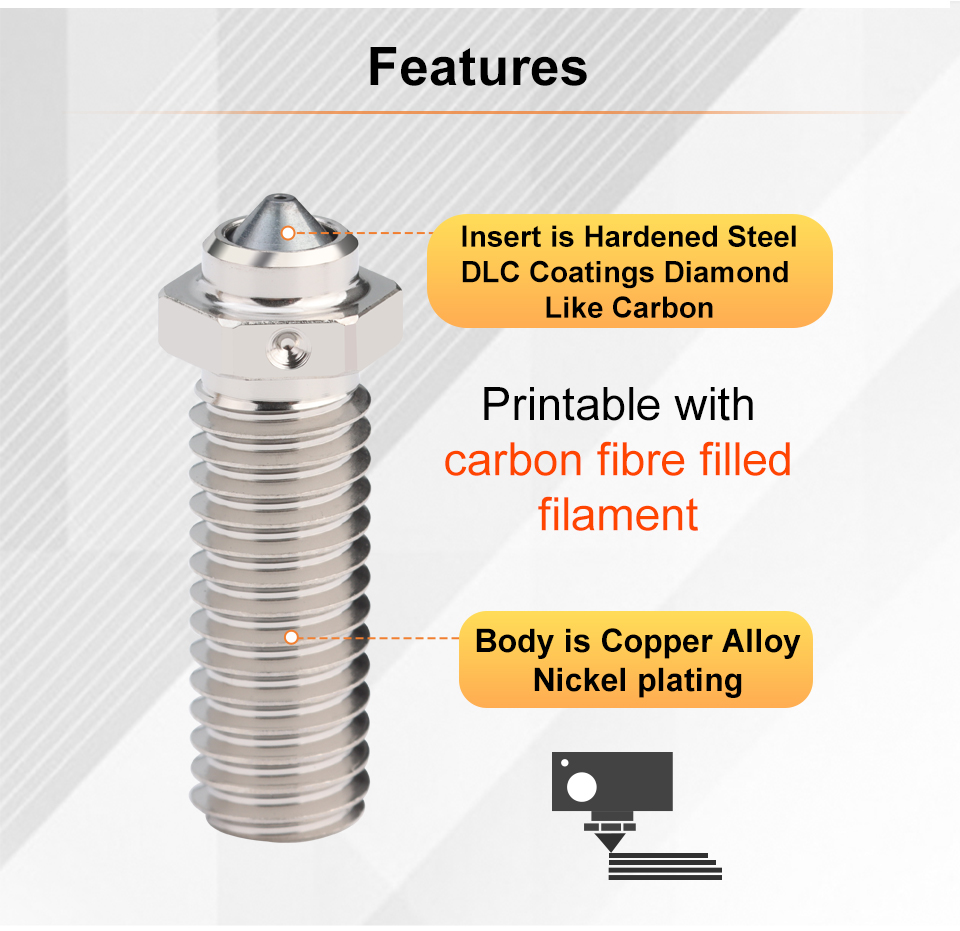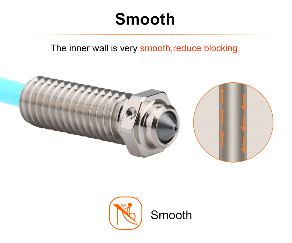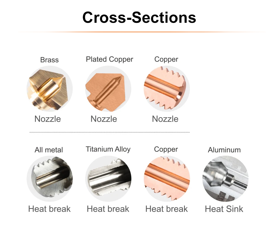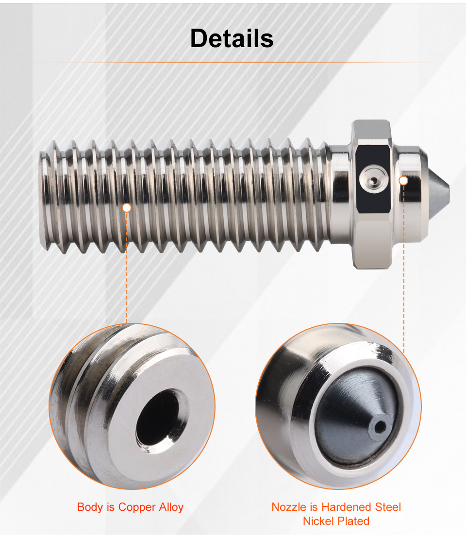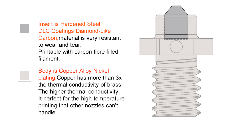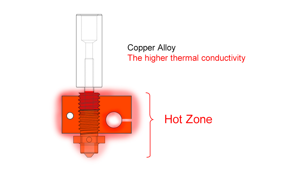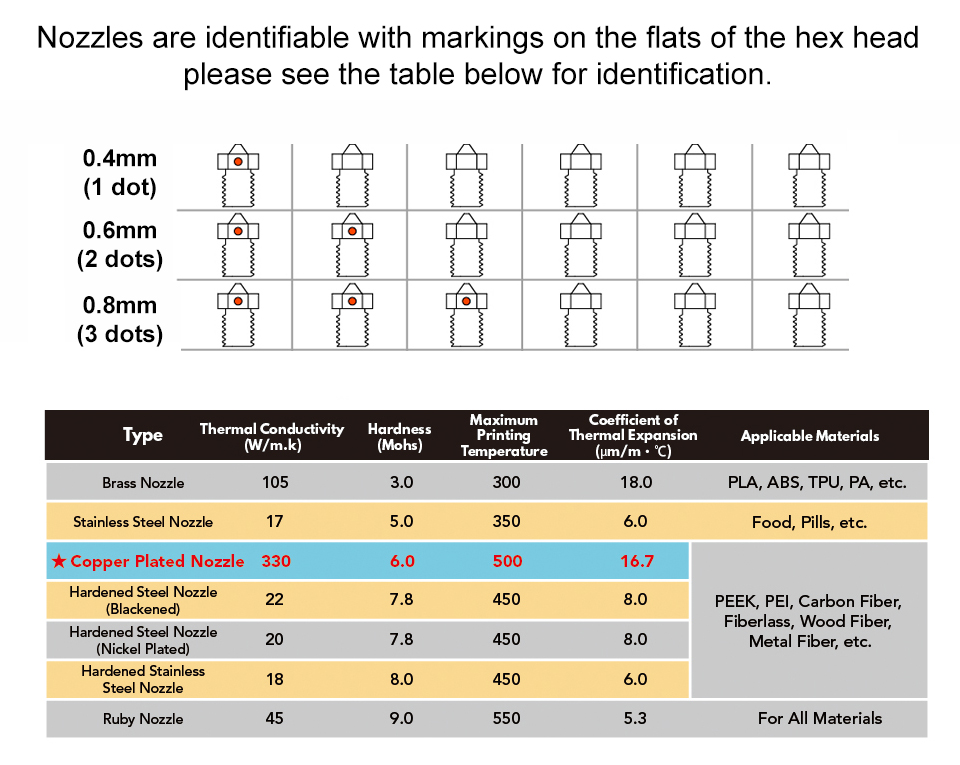Copper has more than 3x the thermal conductivity of brass.The higher thermal conductivity.It perfect for the high-temperature printing that other nozzles can't handle.