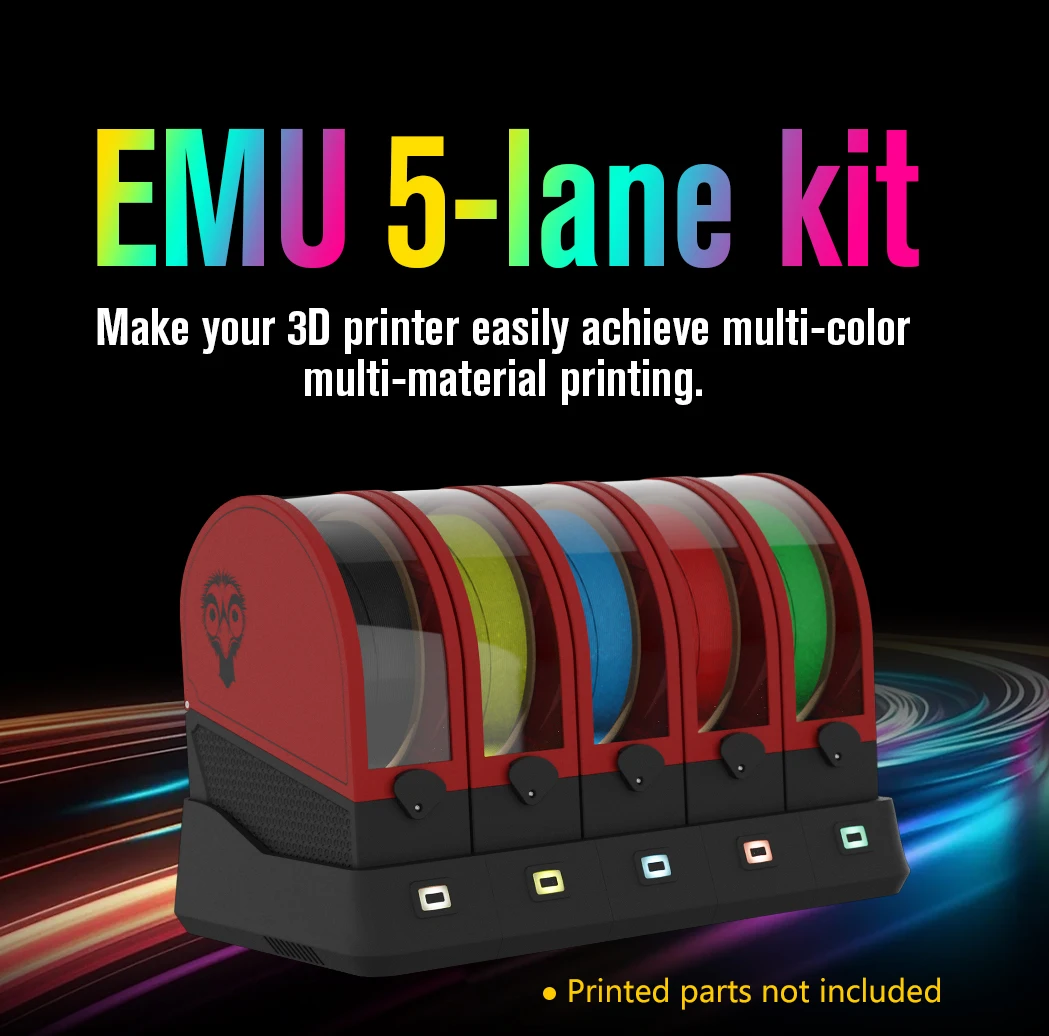 The EMU supports any number of lanes and base configurations; whether it is a single lane setup to assist filament loading, a dual lane configuration for endless spool, or a multi-lane, multi base unit setup for multi-material printing. It is also expandable, with no re-printing of parts required when upgrading from a 2 lane to a multiple lane setup.