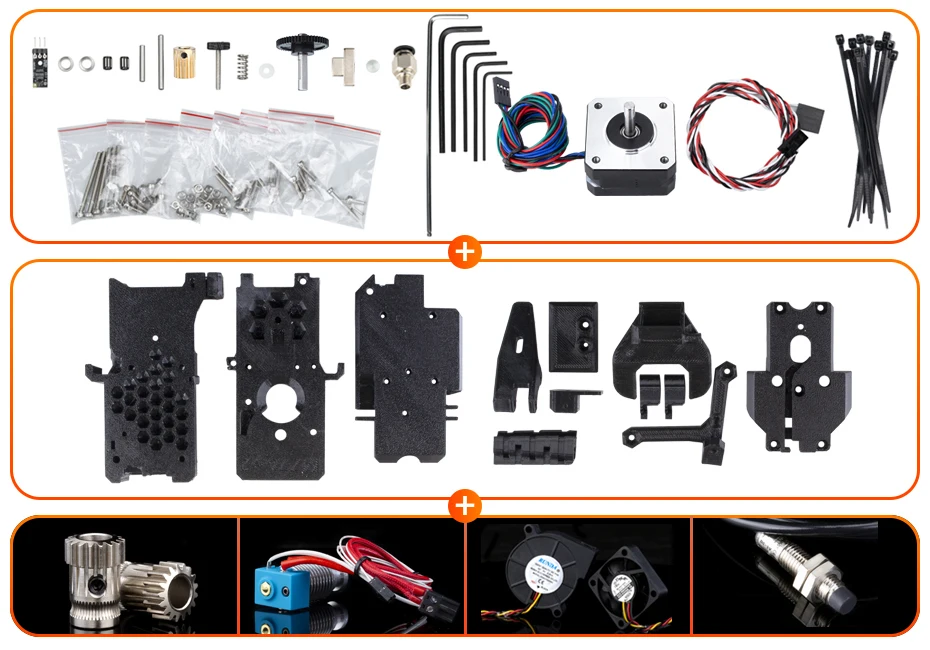 Kit option description:Option 1:23MM PanCake stepper Motor + Motor Gear + DDB SHAFT ASSEMBLY GAER + DDB THUMBSCREW + Needle bearings + Filament sensor +hex wrenchs+ Screw kits + Magnets + Steel ball+Pneumatic connectorCautions:printed parts and dual drive gears are not included in Option 1